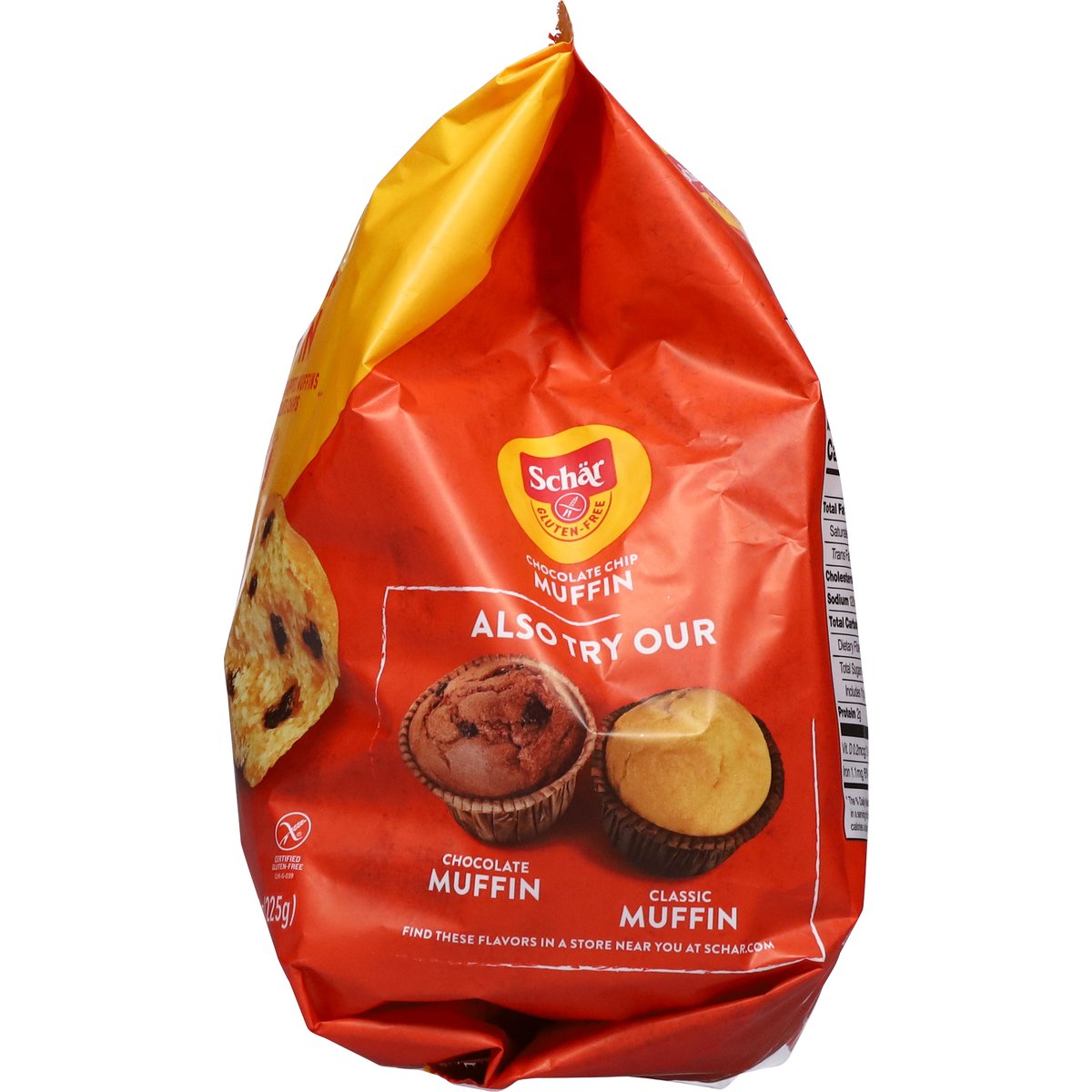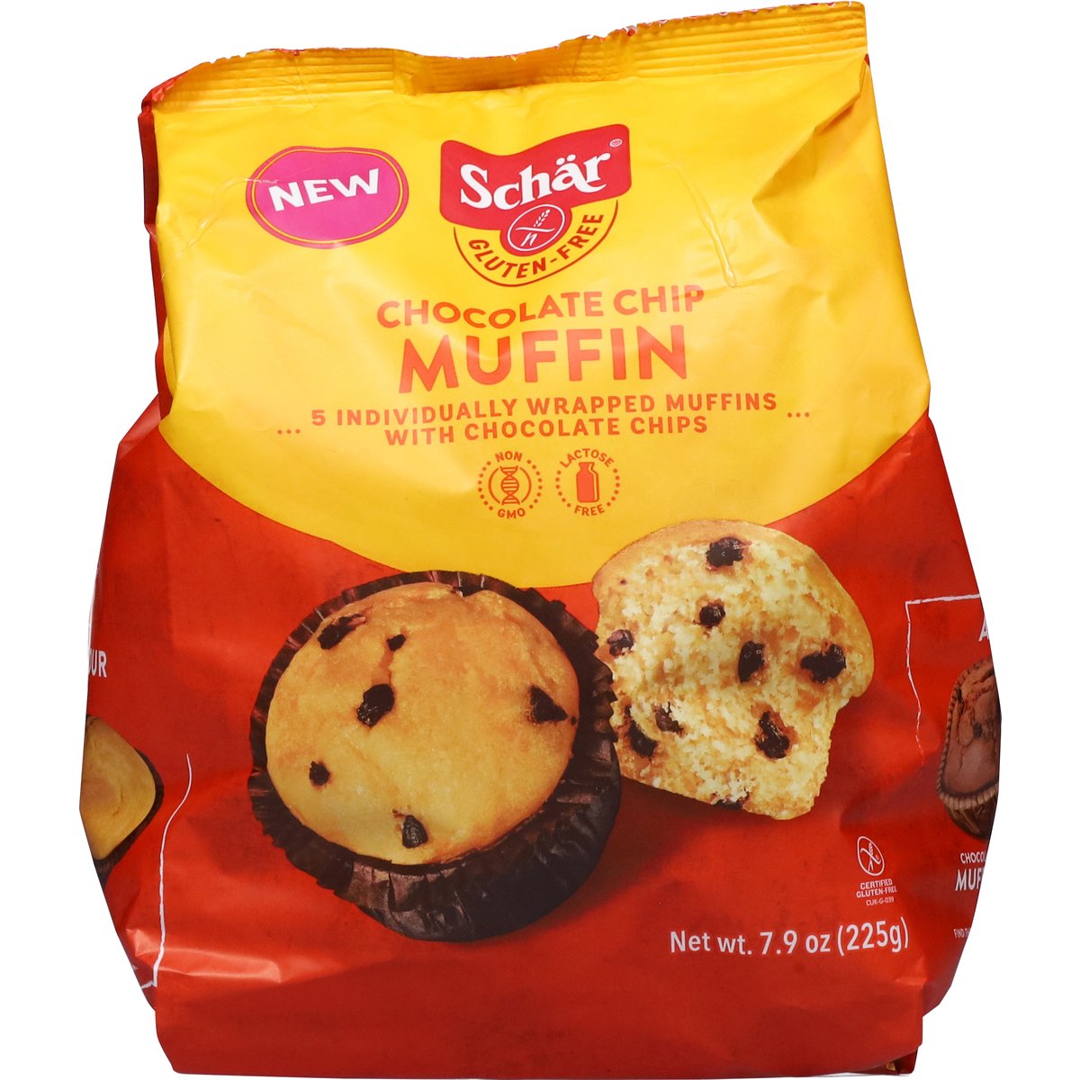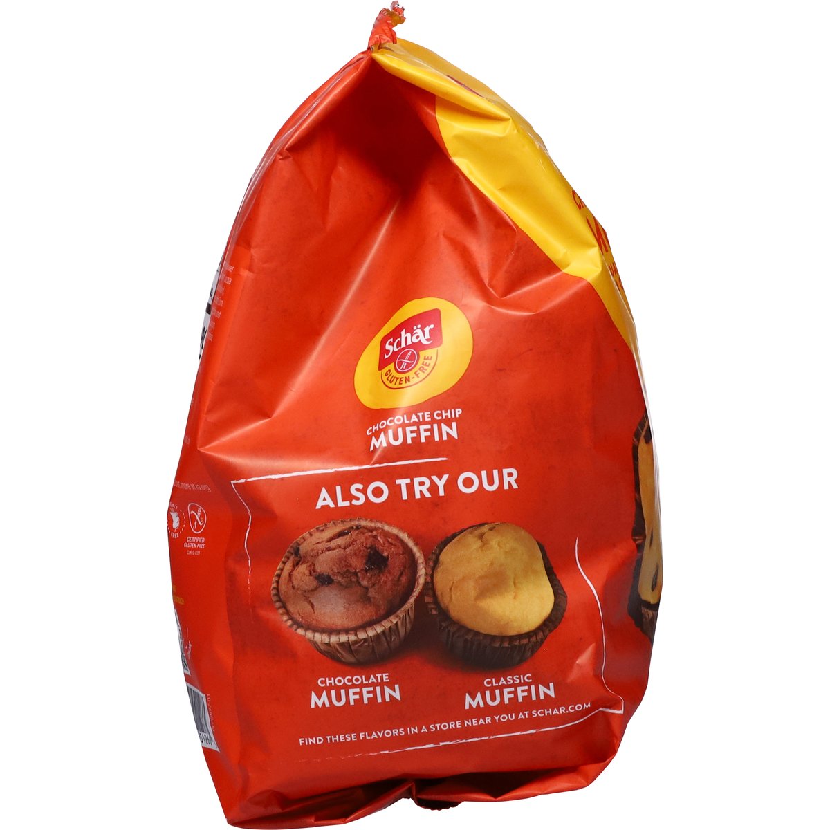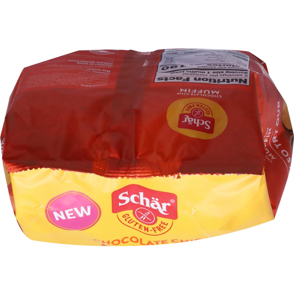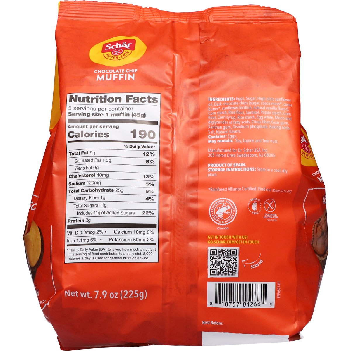 5 Individually wrapped muffins with chocolate chips. Gluten free. Lactose free. Certified gluten free. Wheat free. Non GMO New. go.schar.com/get-in-touch. schar.com. Get in touch with us! go.schar.com/get-in-touch. Scan me. Find these flavors in a store near you at schar.com. Also try our chocolate muffin, classic muffin. Find these flavors in a store near you at schar.com. Rainforest Alliance: People & nature cocoa. Product of Spain.
