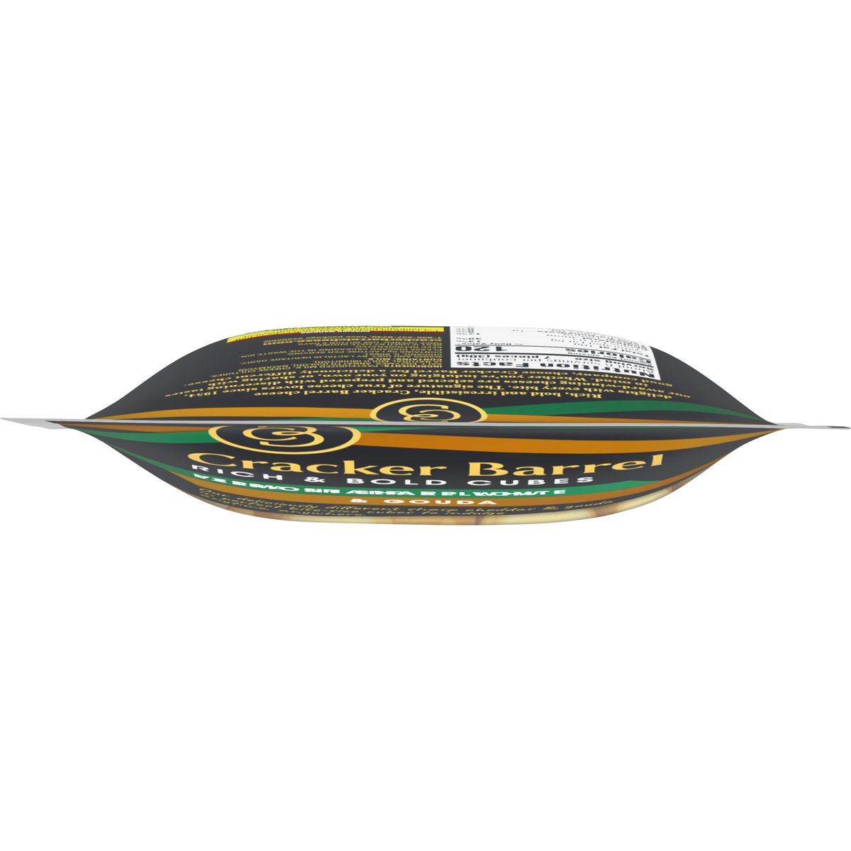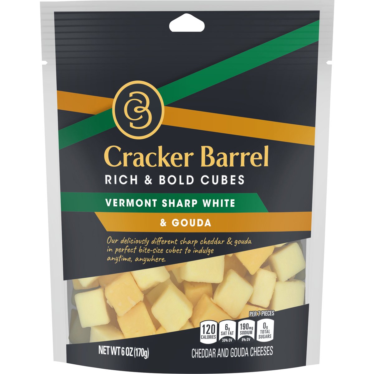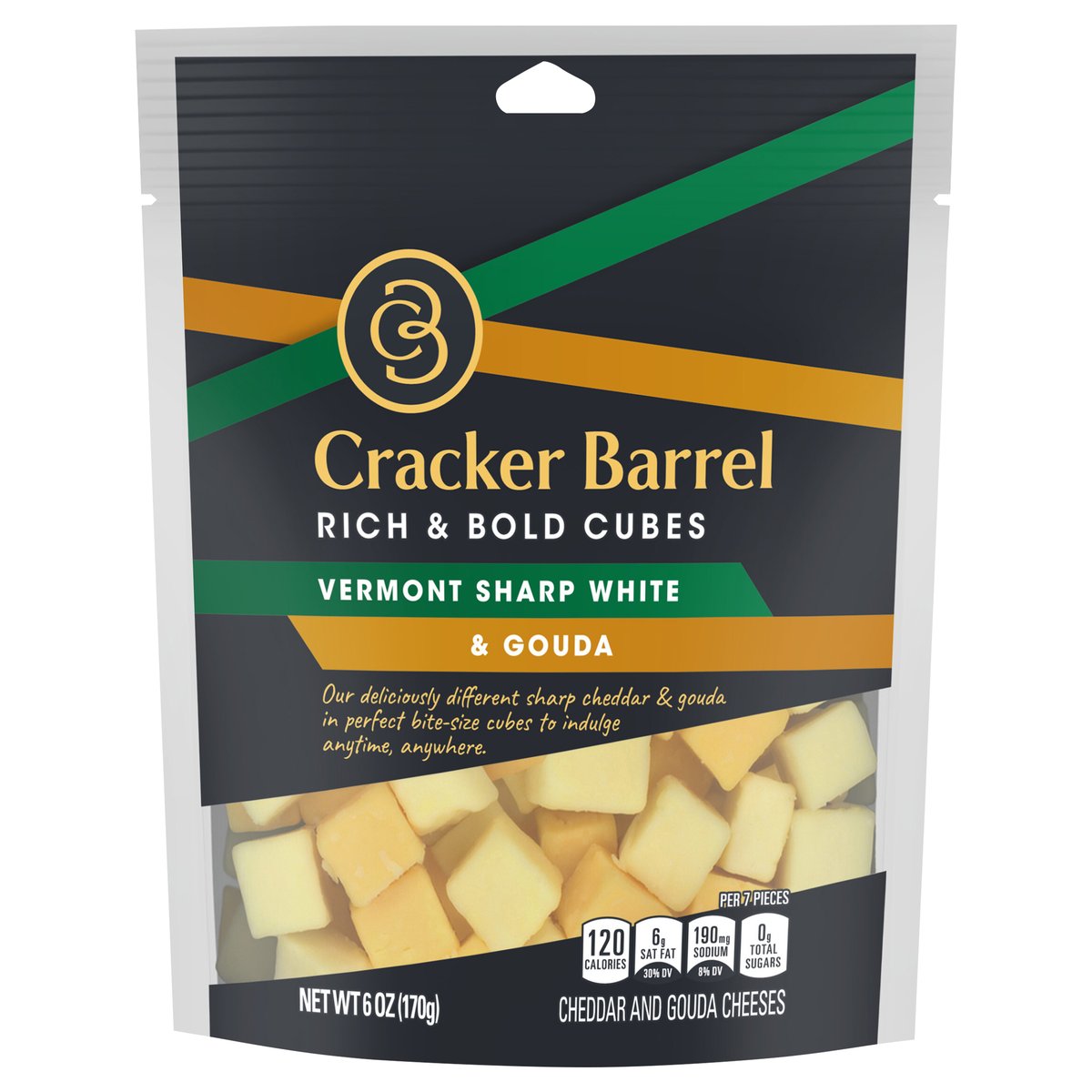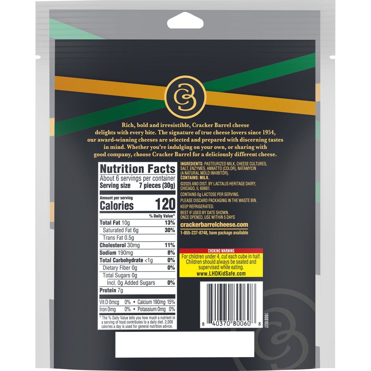Per 7 Pieces: 120 calories; 6 g sat fat (30% DV); 190 mg sodium (8% DV); 0 g total sugars. Contains 0 g lactose per serving. Our deliciously different sharp cheddar & gouda in perfect bite-size cubes to indulge anytime, anywhere. Rich, bold and irresistible, Cracker Barrel cheese delights with every bite. The signature of true cheese lovers since 1954, our award-winning cheeses are selected and prepared with discerning tastes in mind. Whether you're indulging on your own, or sharing with good company, choose Cracker Barrel for a deliciously different cheese. crackerbarrelcheese.com. Crackerbarrelcheese.com. 1-855-237-8748, have package available. Please discard packaging in the waste bin.