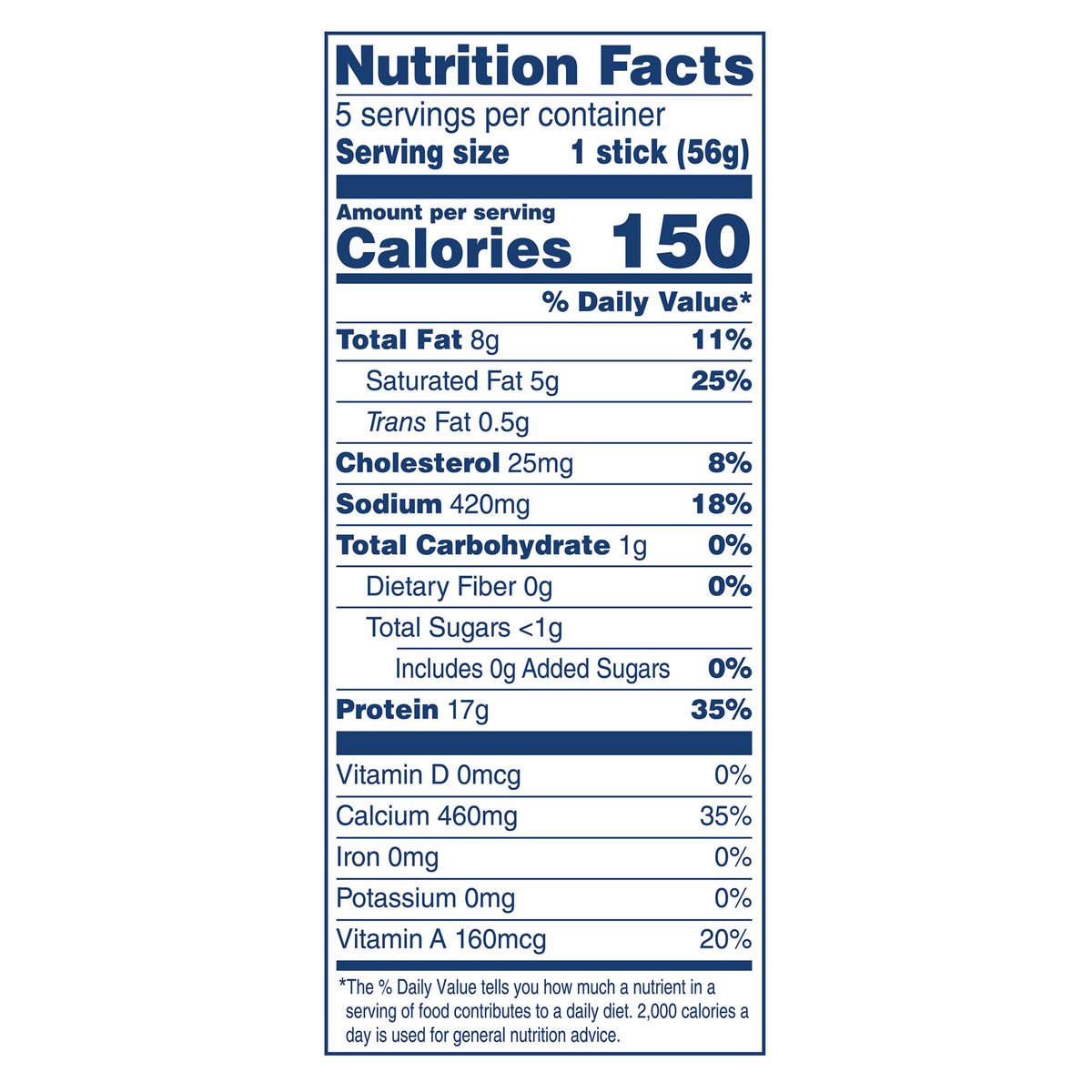 Reduced fat Monterey jack cheese with jalapeno peppers. 17 g protein per stick**. Per Stick: 150 calories; 5 g sat fat (25% DV); 420 mg sodium (18% DV); <1 g total sugars. ** See nutrition information for saturated fat content. 1/2 less fat than Kraft Pepper Jack Cheese. Fat reduced from 17 g to 8 g per serving. No rBST hormone. Made with milk from cows raised without the added rBST hormone*. * No significant difference has been shown between milk derived from rBST-treated and non-rBST-treated cows. kraftnaturalcheese.com. 1-855-543-6875, have package available. Please discard packaging in the waste bin.