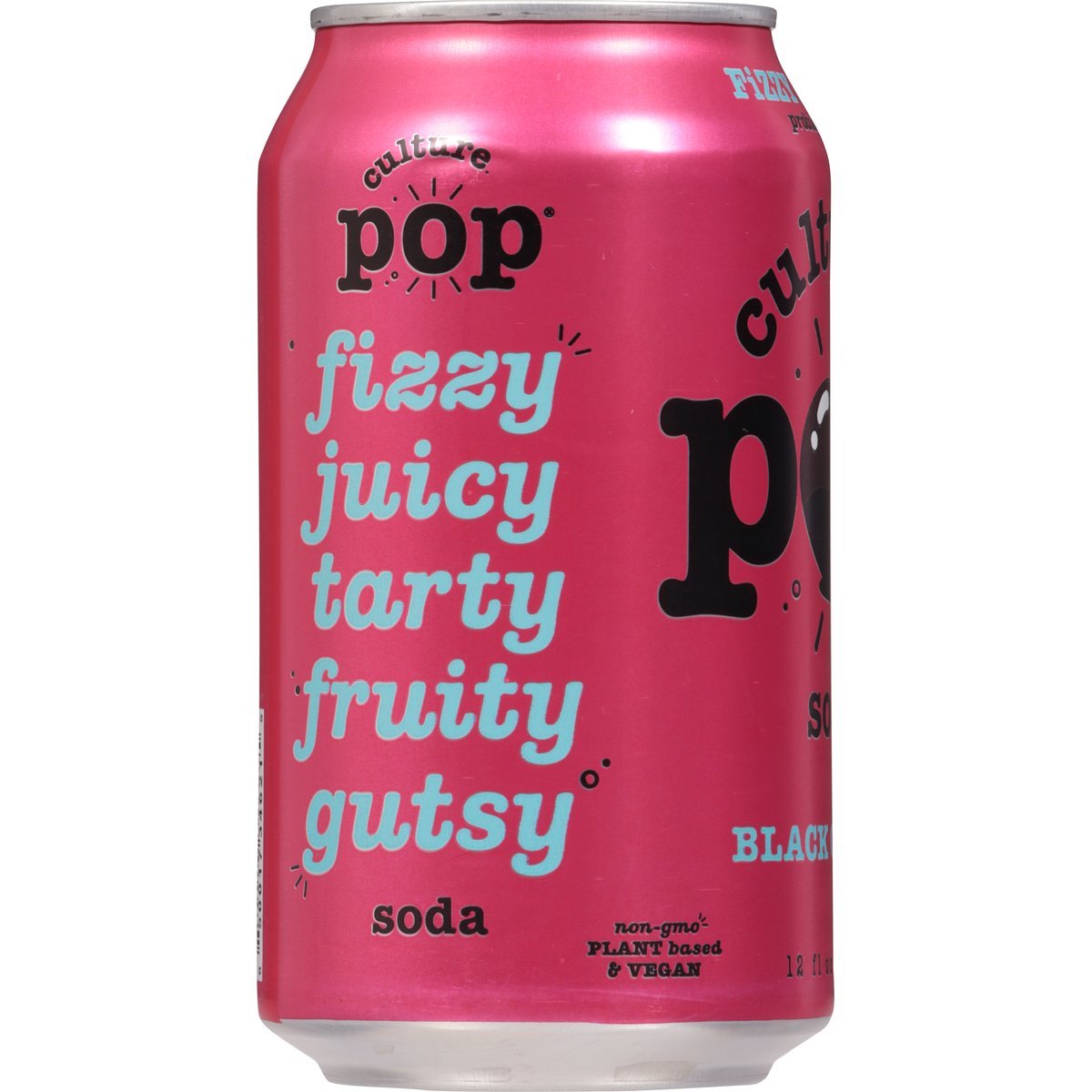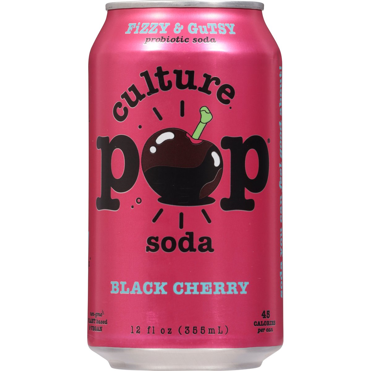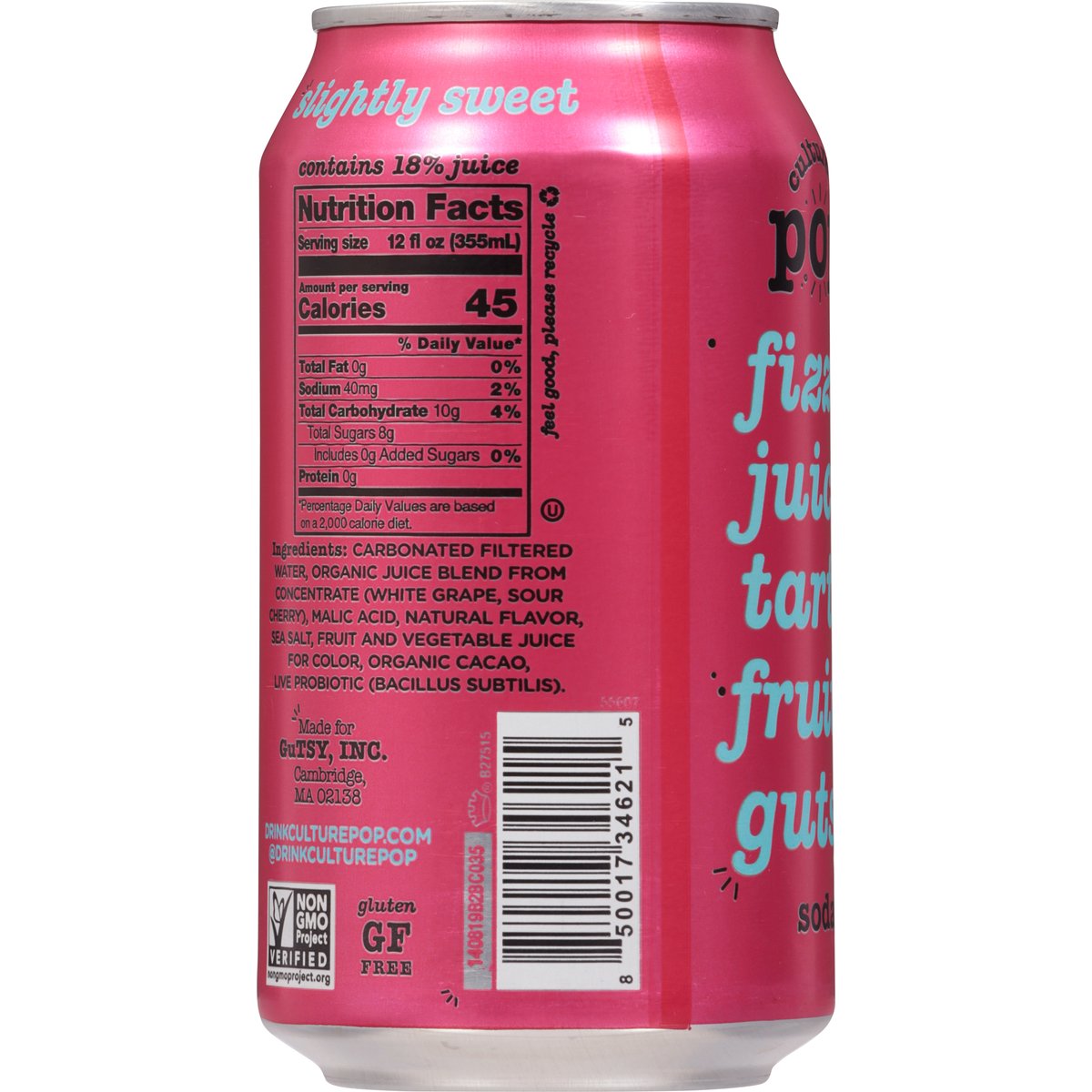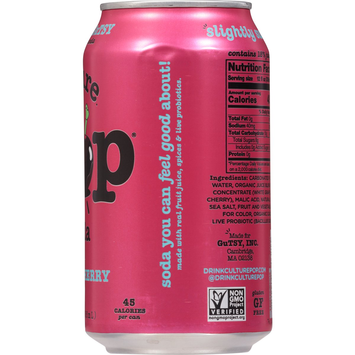 45 calories per can. Plant based & vegan. Gluten free. Non-GMO Project verified. nongmoproject.org. Fizzy & gutsy. Fizzy. Juicy. Tarty. Fruity. Gutsy. Slightly sweet. Soda you can feel good about! drinkculturepop.com. @drinkculturepop. Feel good, please recycle.