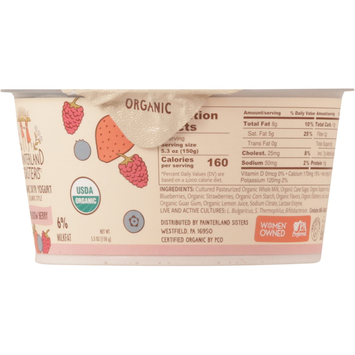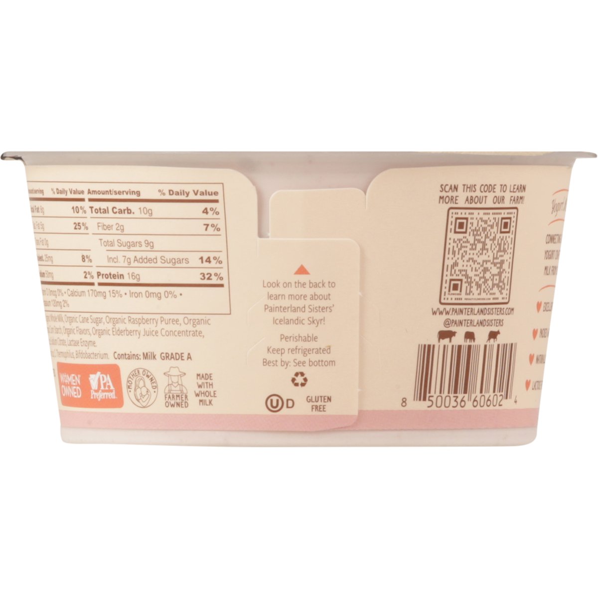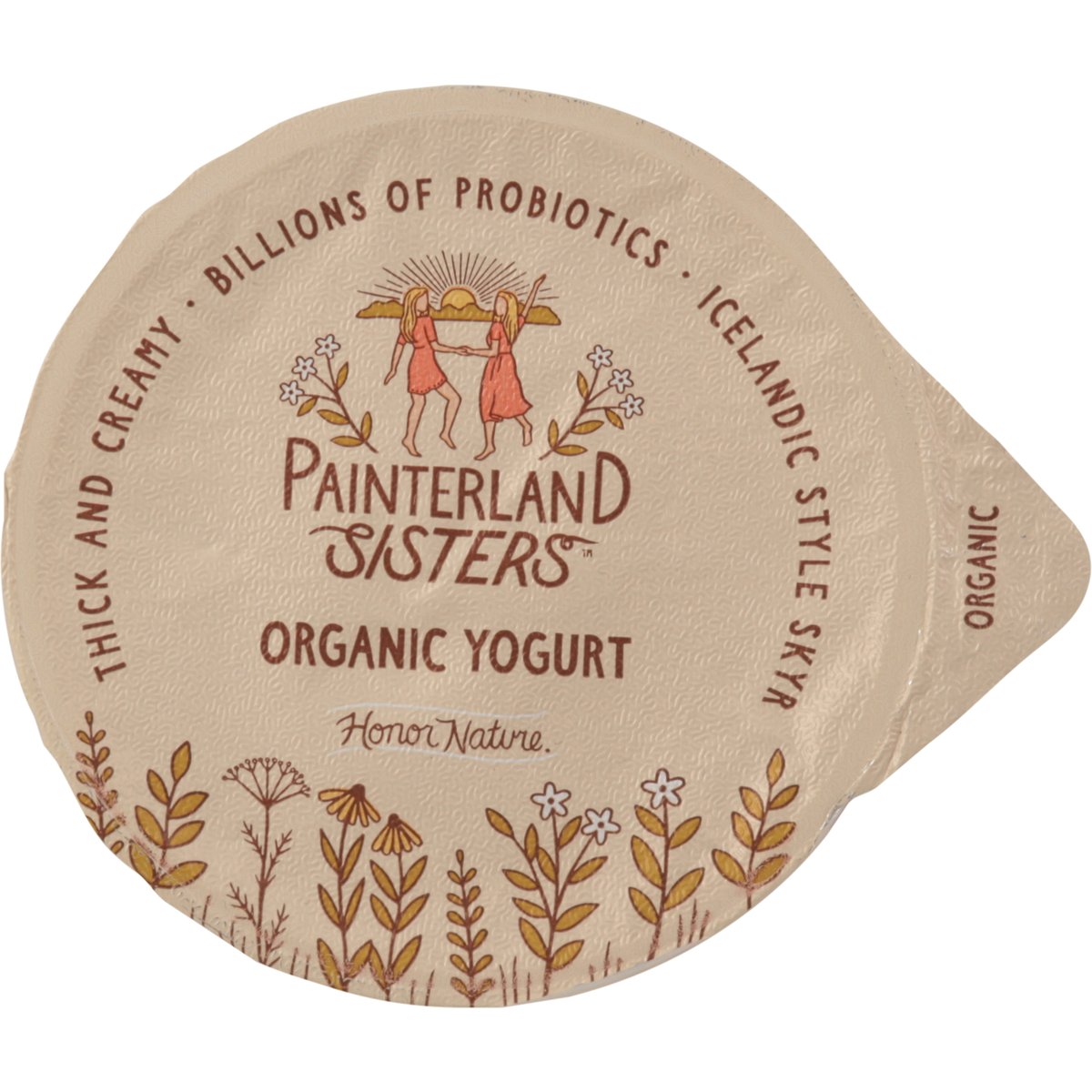 Icelandic style. 16 g protein. USDA Organic. Gluten free. Lactose free. Certified Organic by PCO. 6% milkfat. Excellent source of protein. Organic is Non GMO. Real dairy. Thick and creamy. Billions of probiotics. Honor nature. Look on the back to learn more about Painterland Sisters' Icelandic Skyr. PA preferred. Mother owned. Farmer owned. Yogurt making a difference. Connecting old world Icelandic yogurt craftmanship with fresh milk from our family of farms. Packed with probiotics. Naturally sweetened. Farm to spoon. Regeneratively farmed. Grass-based. Grade A. www.painterlandsisters.com. Scan this code to learn more about our farm! @painterlandsisters.