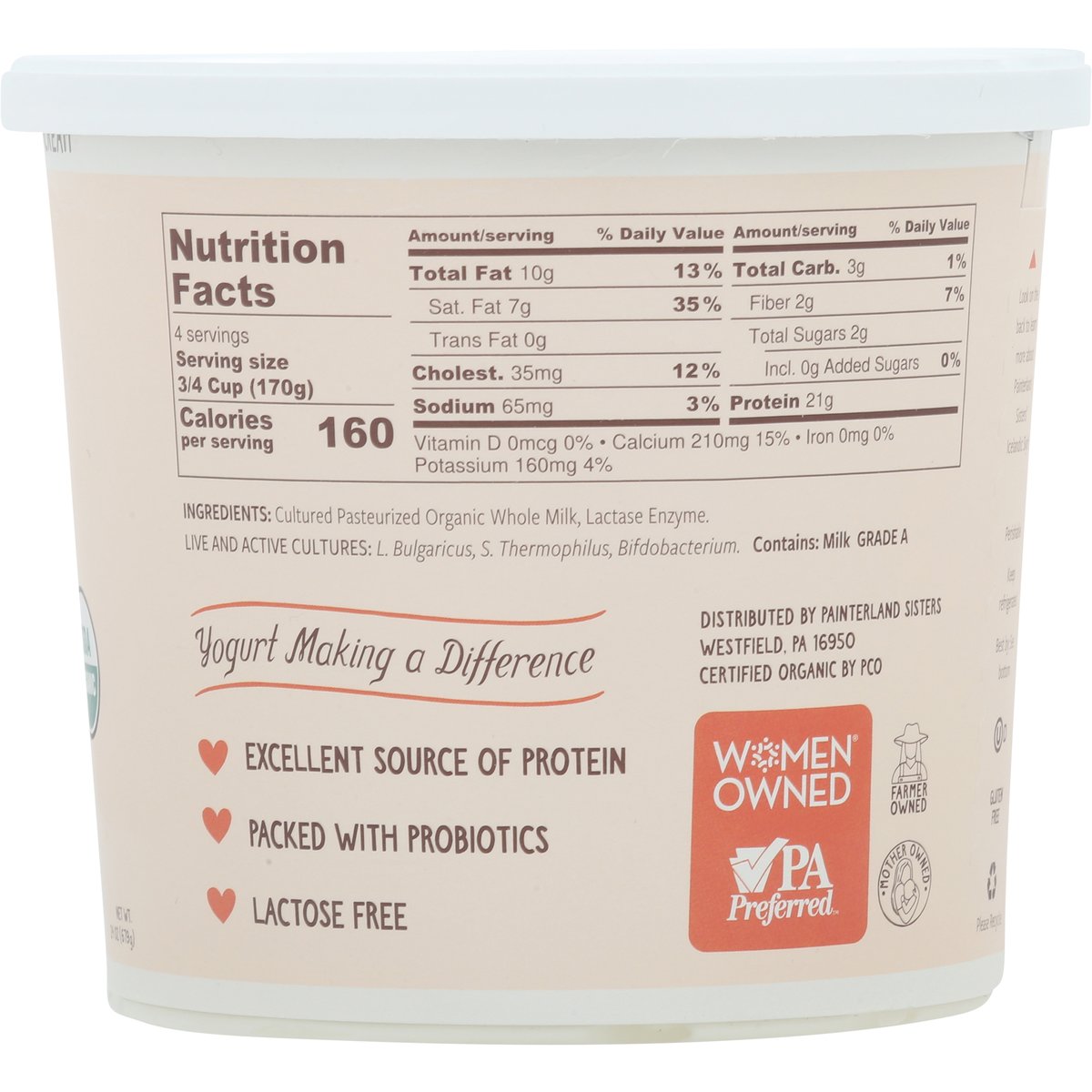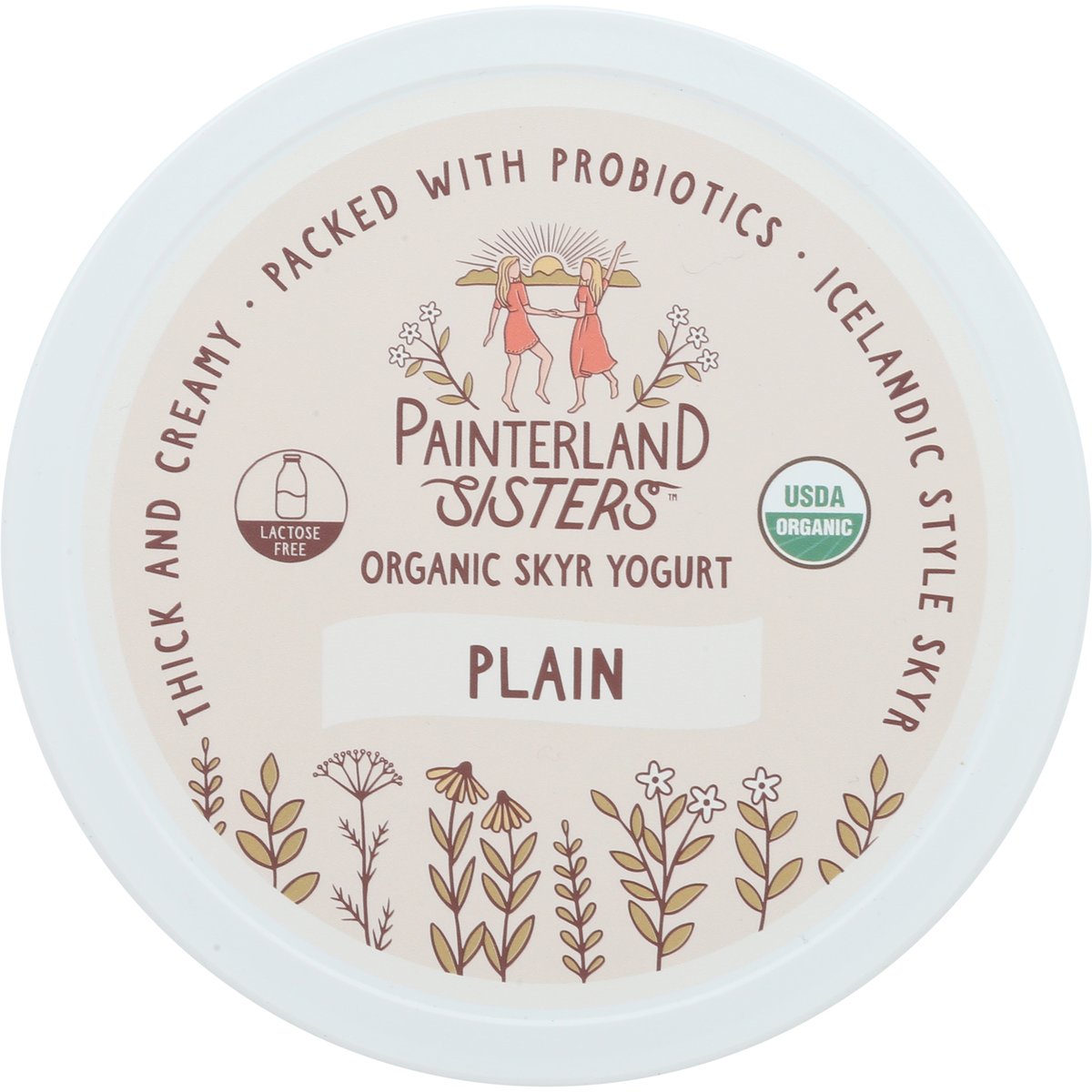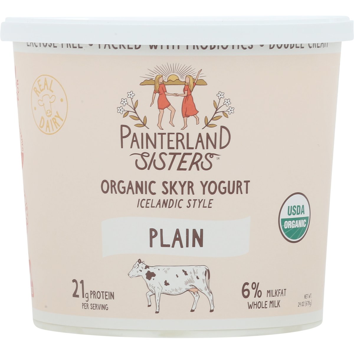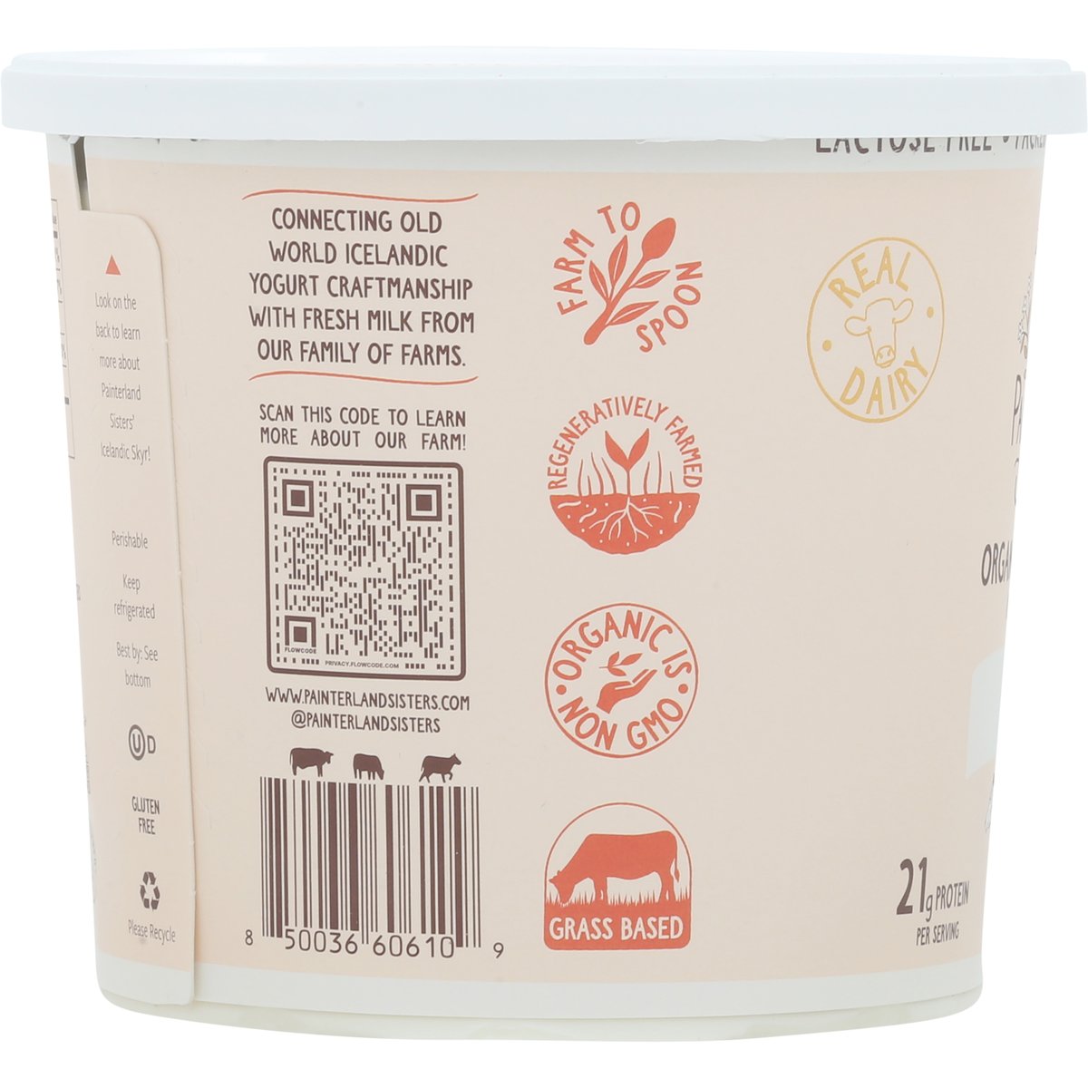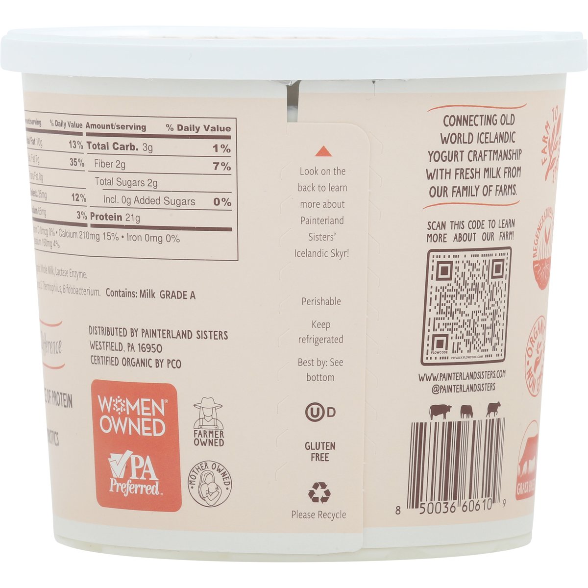21 g protein per serving. USDA Organic. Gluten free. Certified Organic by PCO. Lactose free. 6% milkfat. Excellent source of protein. Organic is non GMO. Real dairy. Farm to spoon. Regeneratively farmed. Grass based. Connecting old world Icelandic yogurt craftmanship with fresh milk from our family of farms. Yogurt making a difference. Packed with probiotics. Thick and creamy. Icelandic style skyr. Grade A. www.painterlandsisters.com. Scan this code to learn more about our farm! (at)painterlandsisters. Women owned. VPA Preferred. Farmer owned. Mother owned. Look on the back to learn more about Painterland Sister's Icelandic Skyr! Please recycle.