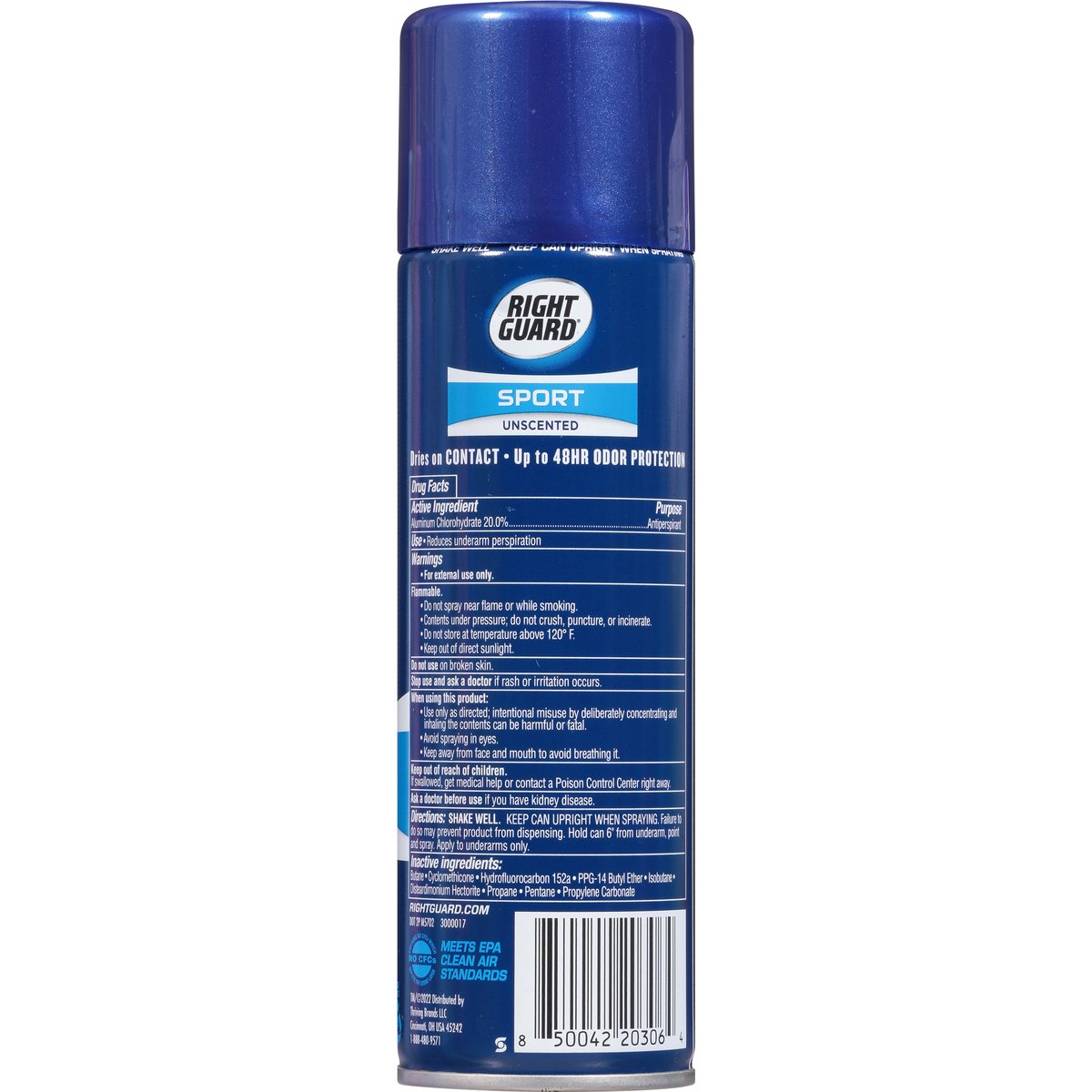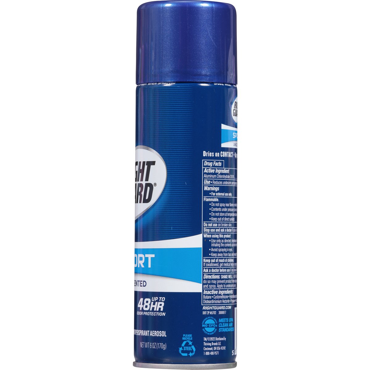 Up to 48 hr odor protection. Dries on contact. Meets EPA clean air standards. rightguard.com. No CFCs: Contains no CFCs which deplete the ozone layer. Please recycle. Made in Canada.