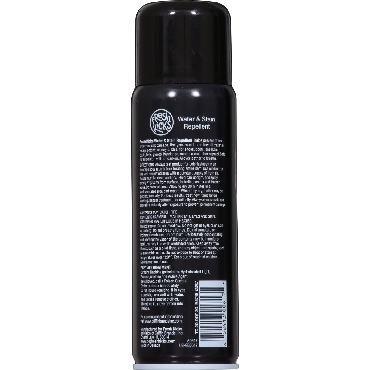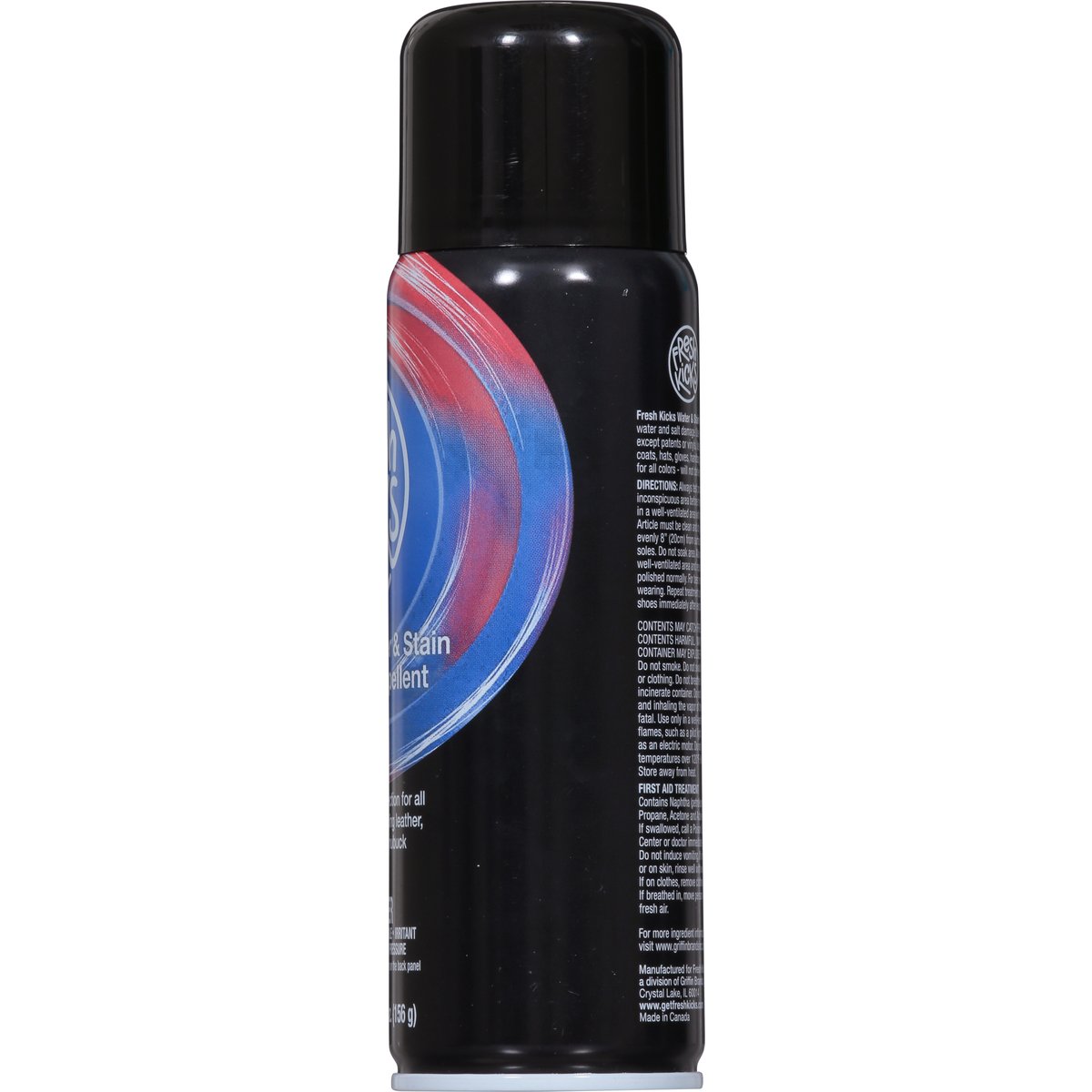 All-season protection for all materials including leather, suede, and nubuck. Fresh Kicks Water & Stain Repellent helps prevent stains, water and salt damage. Use year-round to protect all materials except patents or vinyls. Ideal for shoes, boots, sneakers, coats, hats, gloves, handbags, neckties and other apparel. Safe for all colors will not darken. Allows leather to breathe. www.getfreshkisks.com. For more ingredient information visit www.griffinbrandsinc.com. Made in Canada.