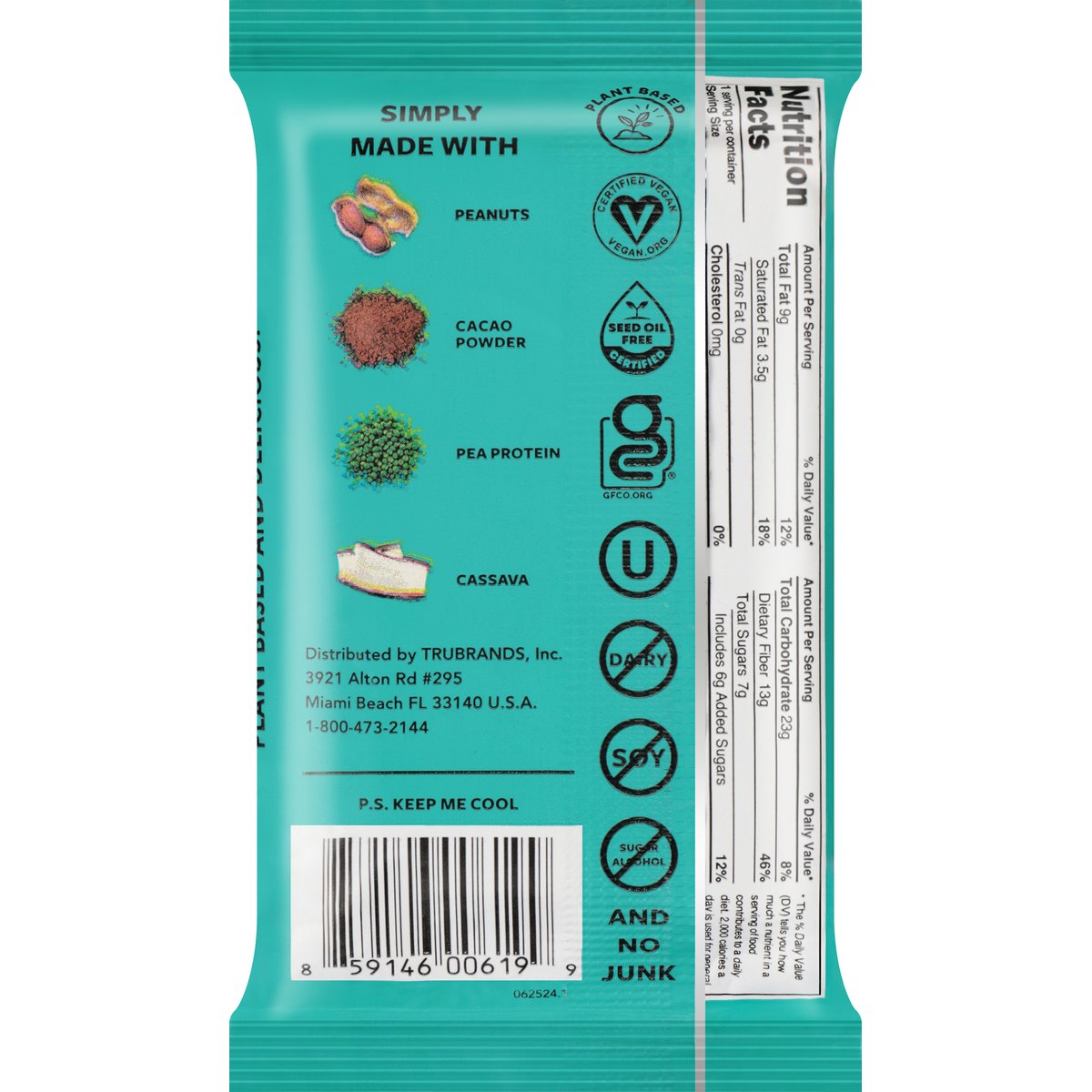 190 Calories. 12g Protein. 13g fiber. No gluten. No dairy. No soy. Certified vegan. Vegan.org. Certified gluten free. gfco.org. Non-GMO Project verified. nongmoproject.org. Yeah... It's a protein bar. No sugar alcohols. All delicious. Simply made with: Peanuts. Cacao powder. Pea protein. Cassava. And no junk. P.S. Keep me cool. Certified Seed Oil Free. Trubar.com. Join us at Trubar.com.