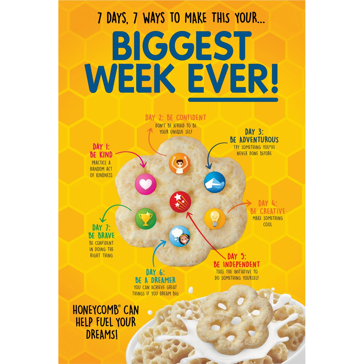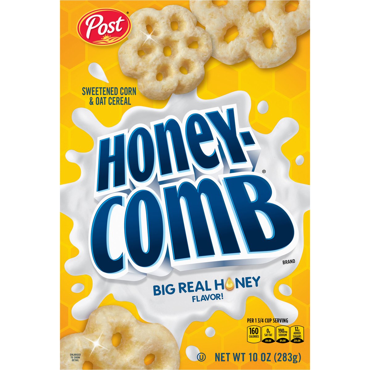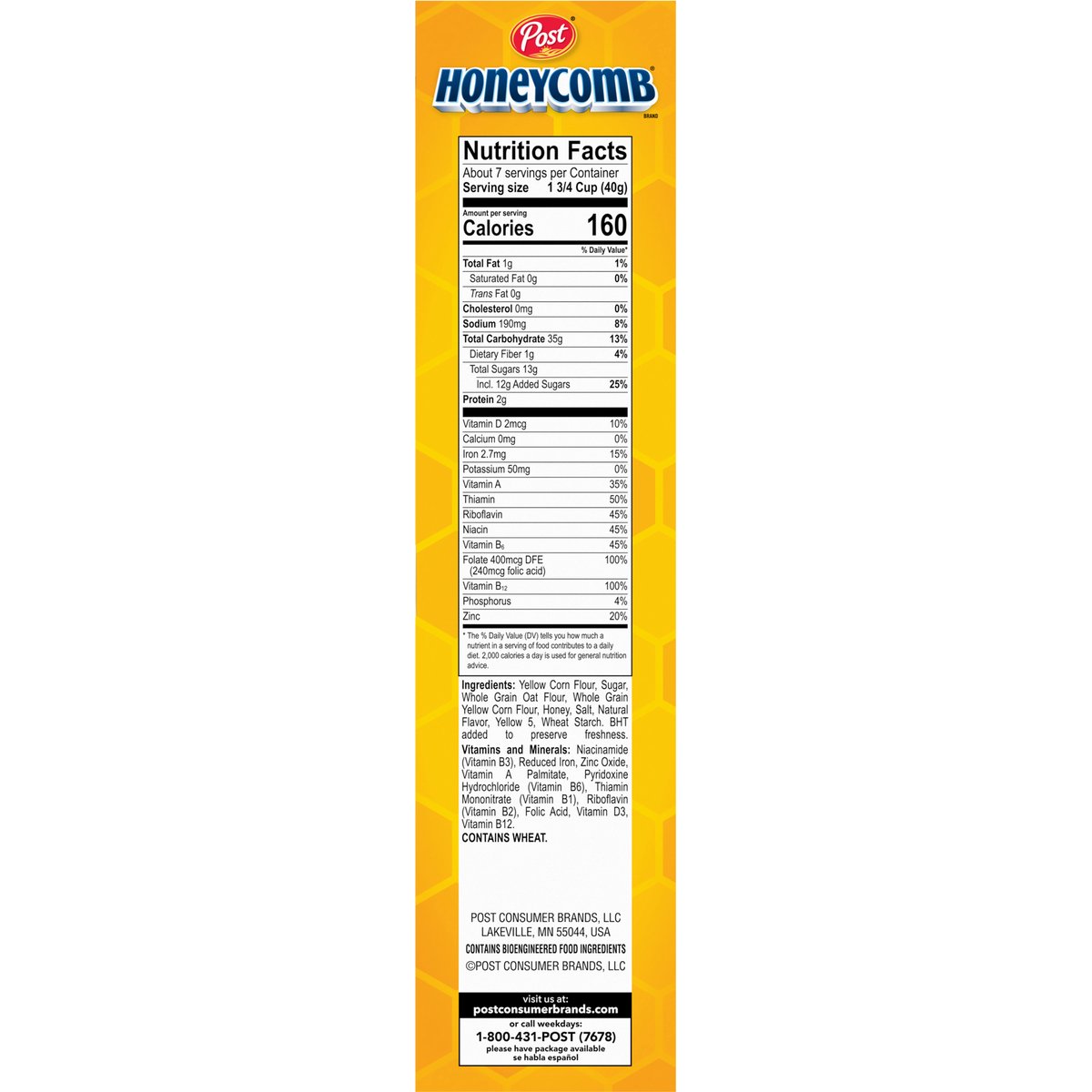 Sweetened corn & oat cereal. Per 1-3/4 Cup Serving: 160 calories: 0 g sat fat (0% DV); 190 mg sodium (8%DV); 12 g added sugars (25% DV). Whole grain 10 g or more per serving. Eat 48 g or more of whole grain daily. WholeGrainsCouncil.org. Contains bioengineered food ingredients. 7 days, 7 ways to make this your…biggest week ever! Day 1: Be kind. Practice a random act of kindness. Day 2: Be confident. Don’t be afraid to be your unique self. Day 3: Be adventurous. Try something you’ve never done before. Day 4: Be creative. Make something cool. Day 5: Be independent. Take the initiative to do something yourself. Day 6: Be a dreamer. You can achieve great things if you dream big. Day 7: Be brave. Be confident in doing the right thing. Honeycomb can help fuel your dreams! postconsumerbrands.com. how2recycle.info. Visit us at: postconsumerbrands.com or call weekdays: 1-800-431-Post (7678) please have package available. Certified 100% recycled paperboard.